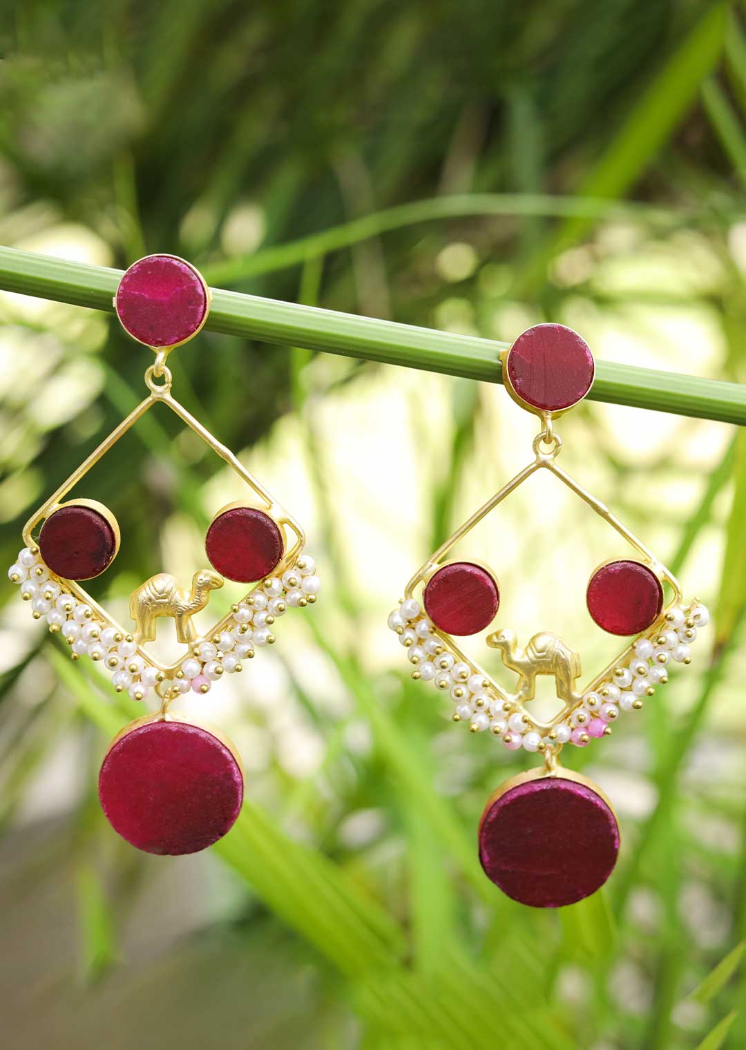 A pair of ethnic-inspired drop earrings. These stunning earrings in a maroon color add a touch of elegance to every outfit. Perfect for both casual and formal occasions, they effortlessly blend cultural charm with contemporary fashion.