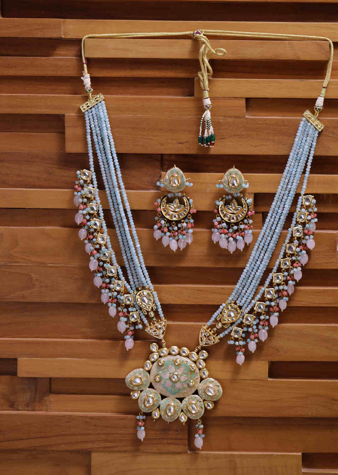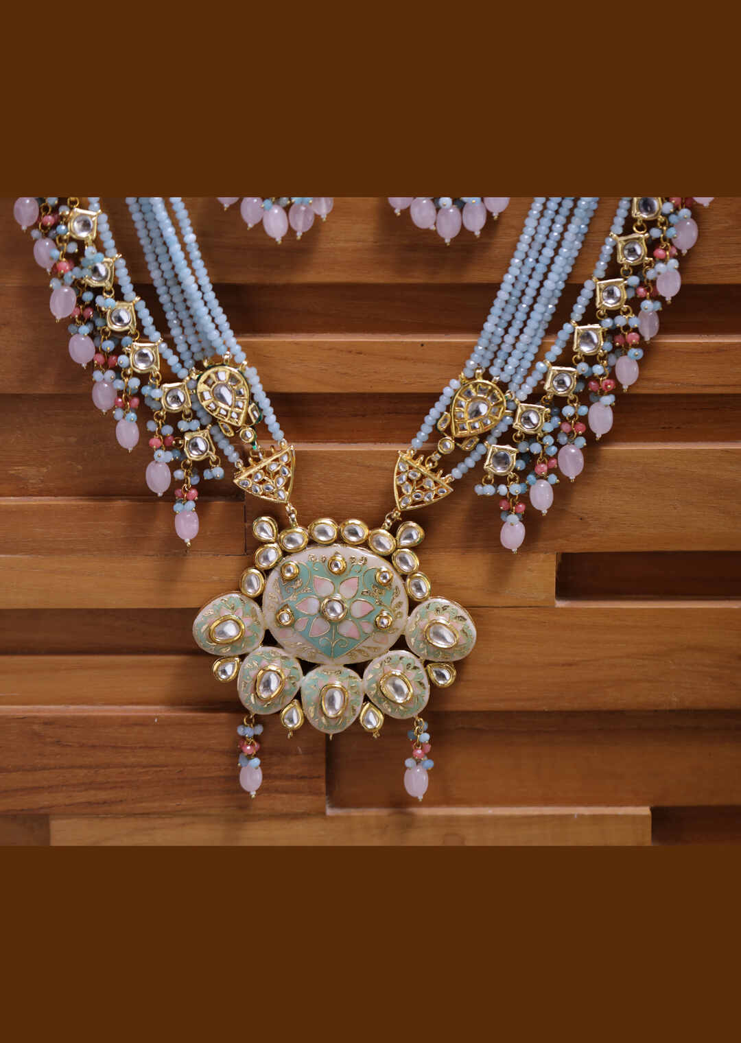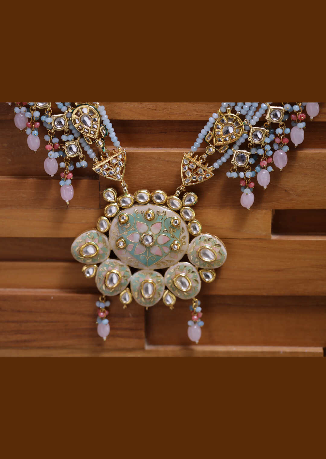 Step into the world of luxury with this stunning, one-of-a-kind kundan and bead necklace set. Handcrafted with intricate detailing, this set showcases a breathtaking combination of pastel beads, pink teardrop stones, and the timeless charm of kundan stones. The necklace features a captivating centerpiece with delicate floral patterns, while the matching earrings elevate the grandeur of this set.