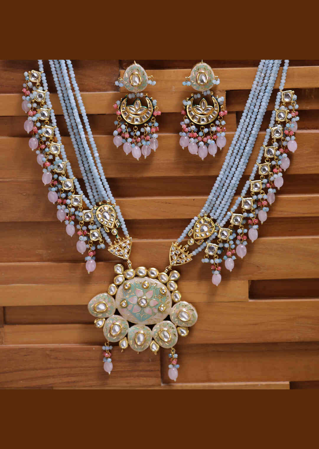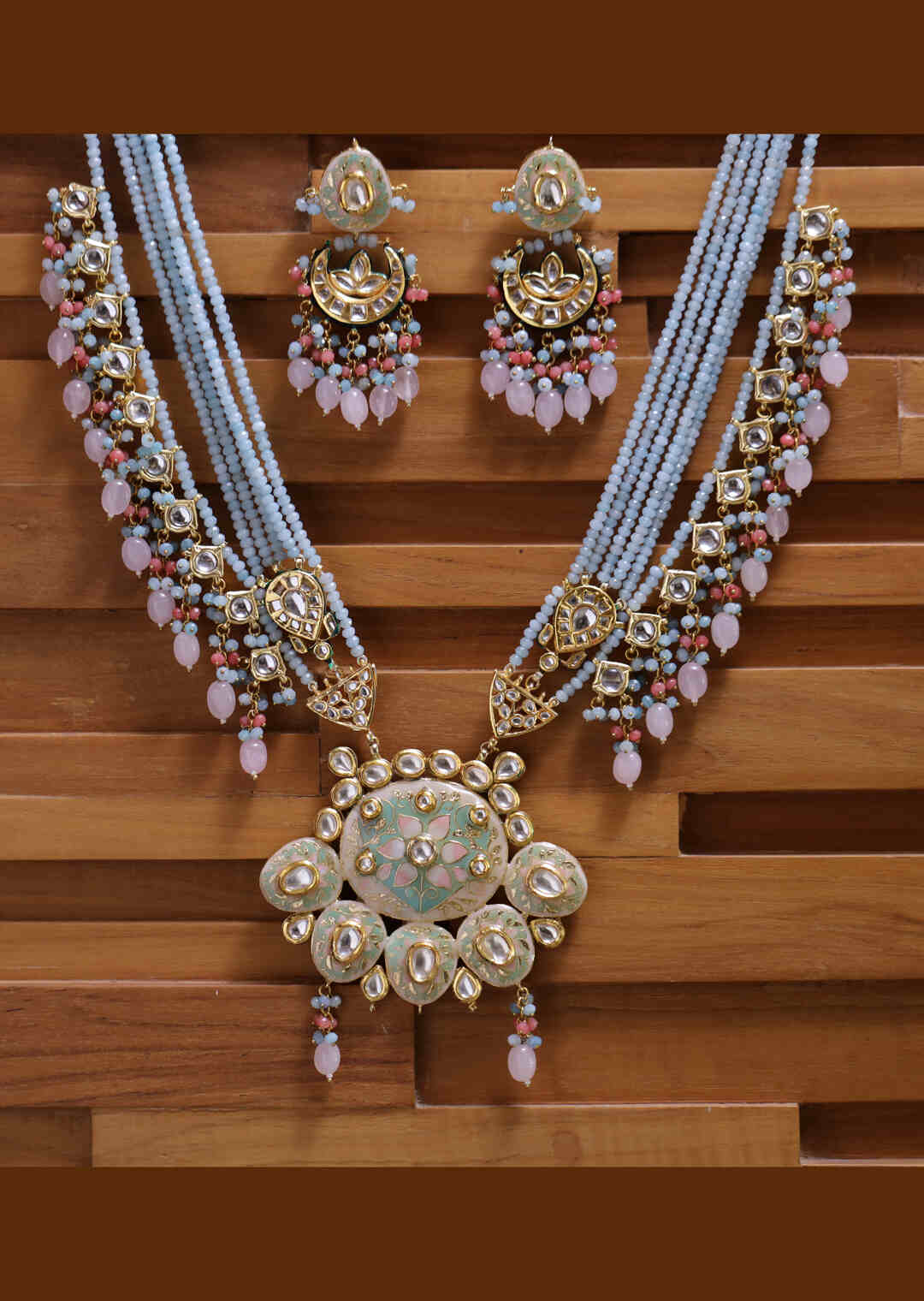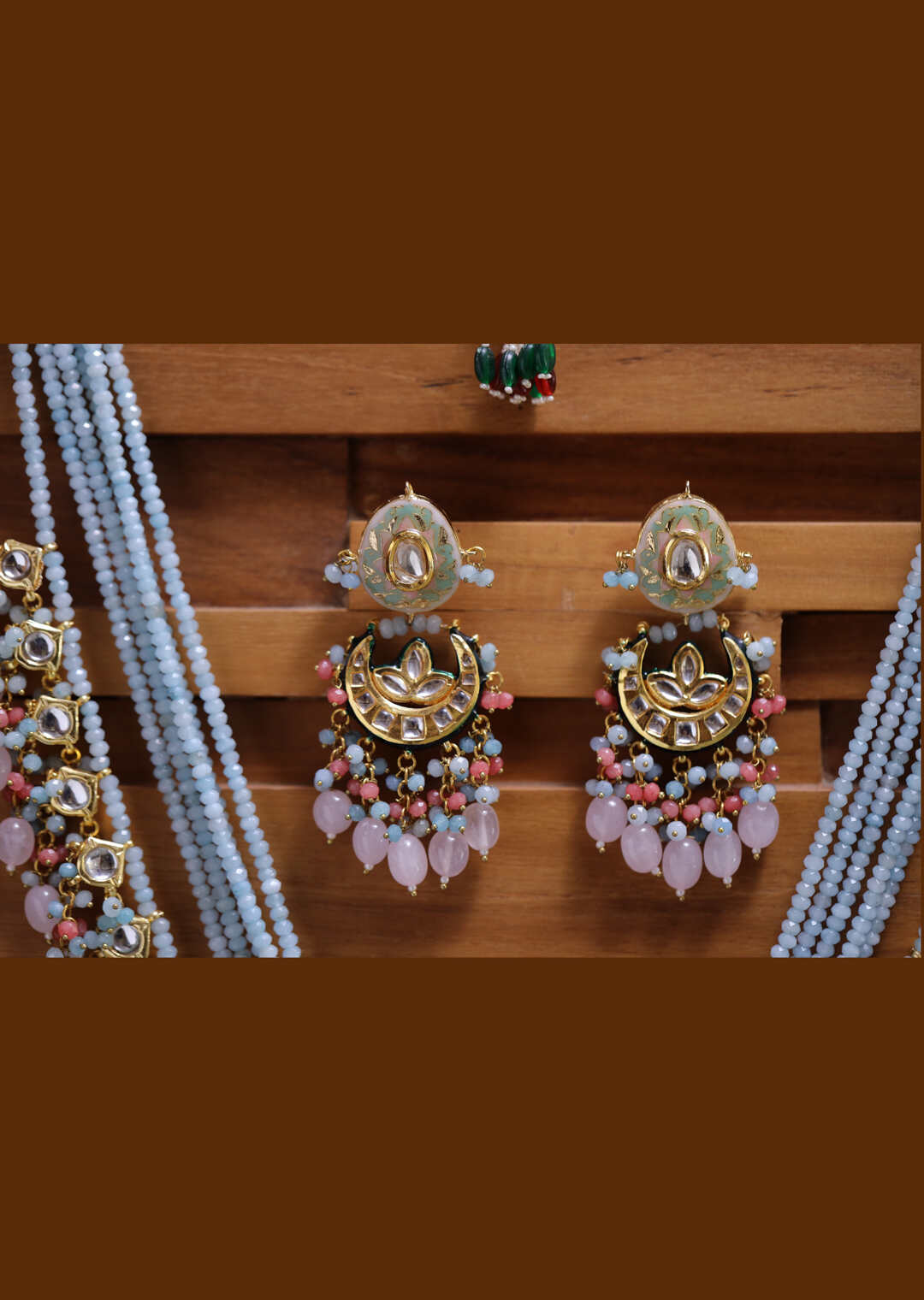 Step into the world of luxury with this stunning, one-of-a-kind kundan and bead necklace set. Handcrafted with intricate detailing, this set showcases a breathtaking combination of pastel beads, pink teardrop stones, and the timeless charm of kundan stones. The necklace features a captivating centerpiece with delicate floral patterns, while the matching earrings elevate the grandeur of this set.