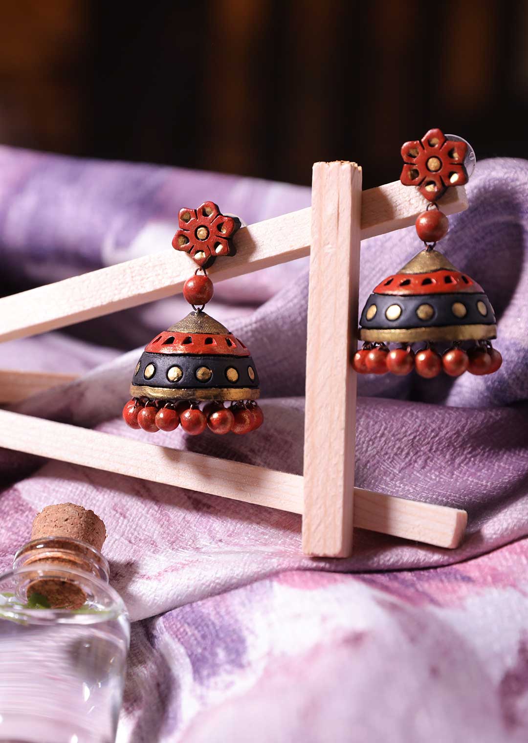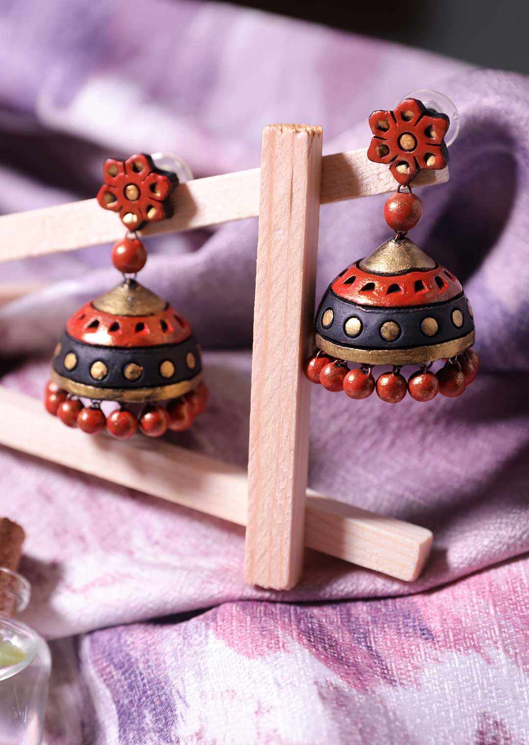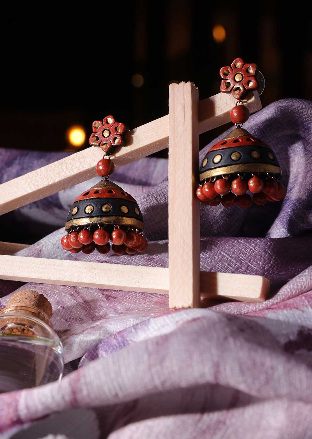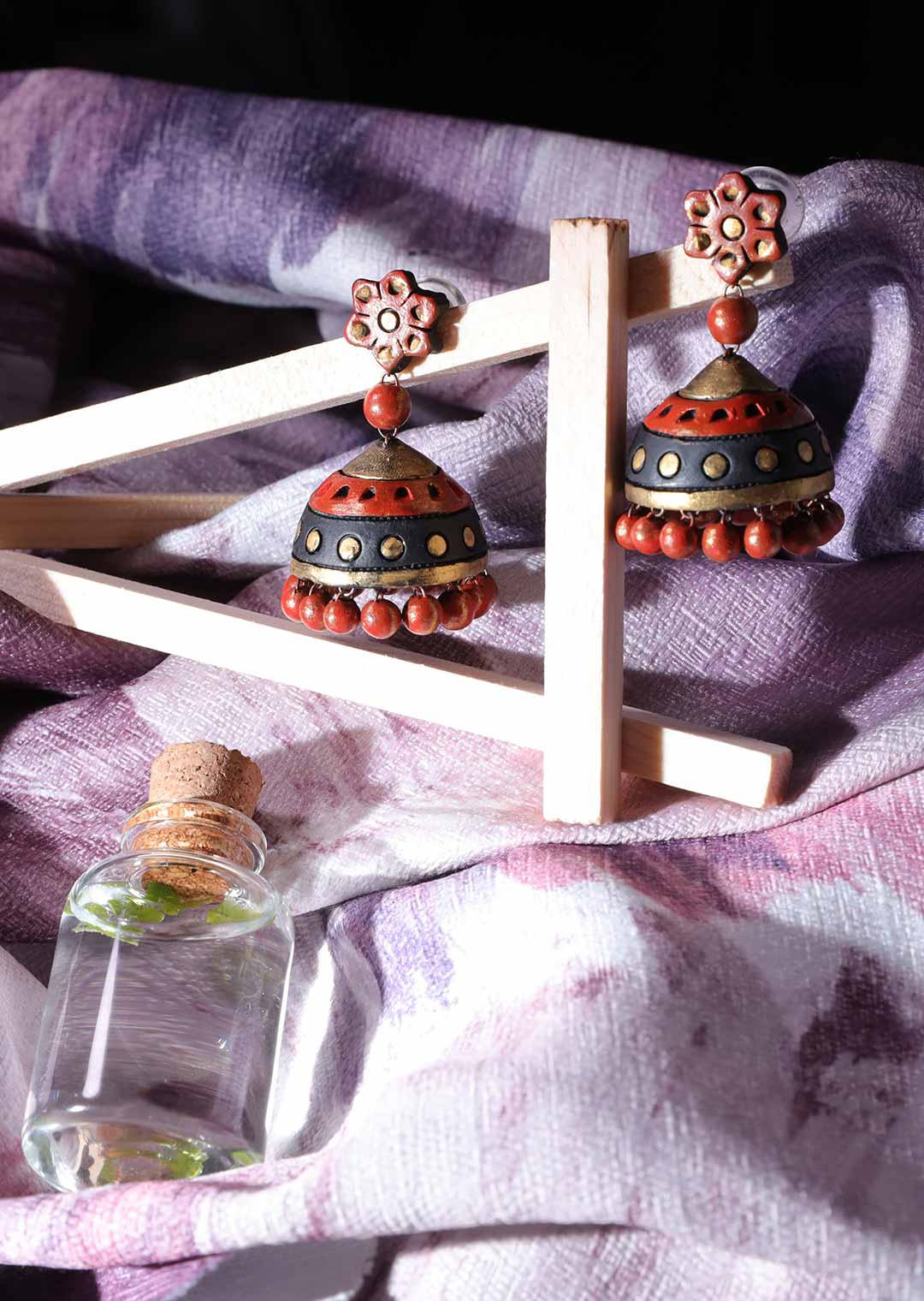 Elevate your style with our exquisite dark red colored terracotta earrings. Crafted with meticulous attention to detail, these earrings blend the earthy charm of terracotta with the rich allure of dark red hues. Each piece is lovingly handcrafted, ensuring a unique and one-of-a-kind accessory. The deep, lustrous red color adds a touch of sophistication and warmth to your ensemble, making them perfect for both casual and formal occasions. Whether you're dressing up for a special event or adding a pop of color to your everyday look, these earrings are a versatile and striking choice. Embrace the timeless beauty of terracotta with a contemporary twist by adorning yourself with these dark red treasures that capture the essence of elegance and individuality.
