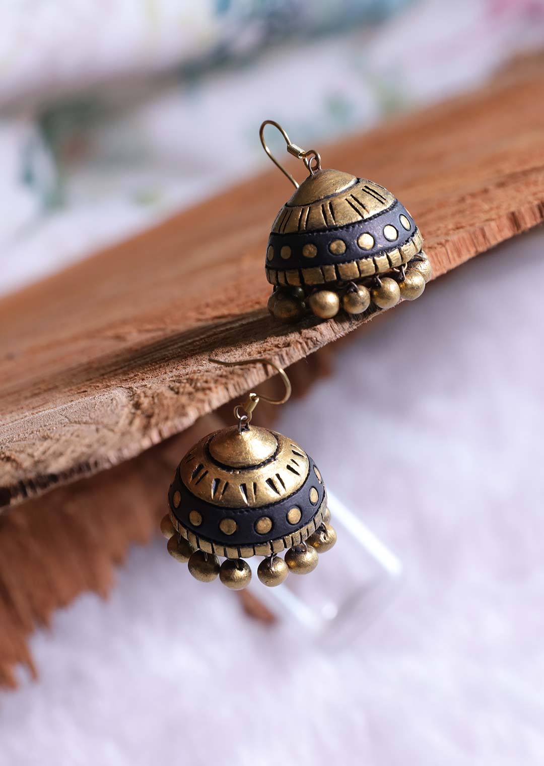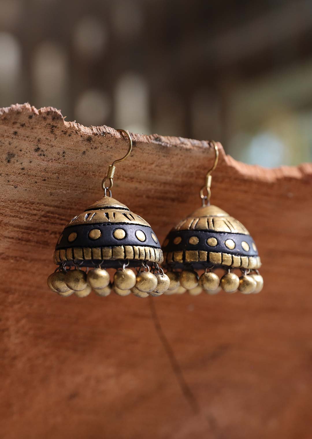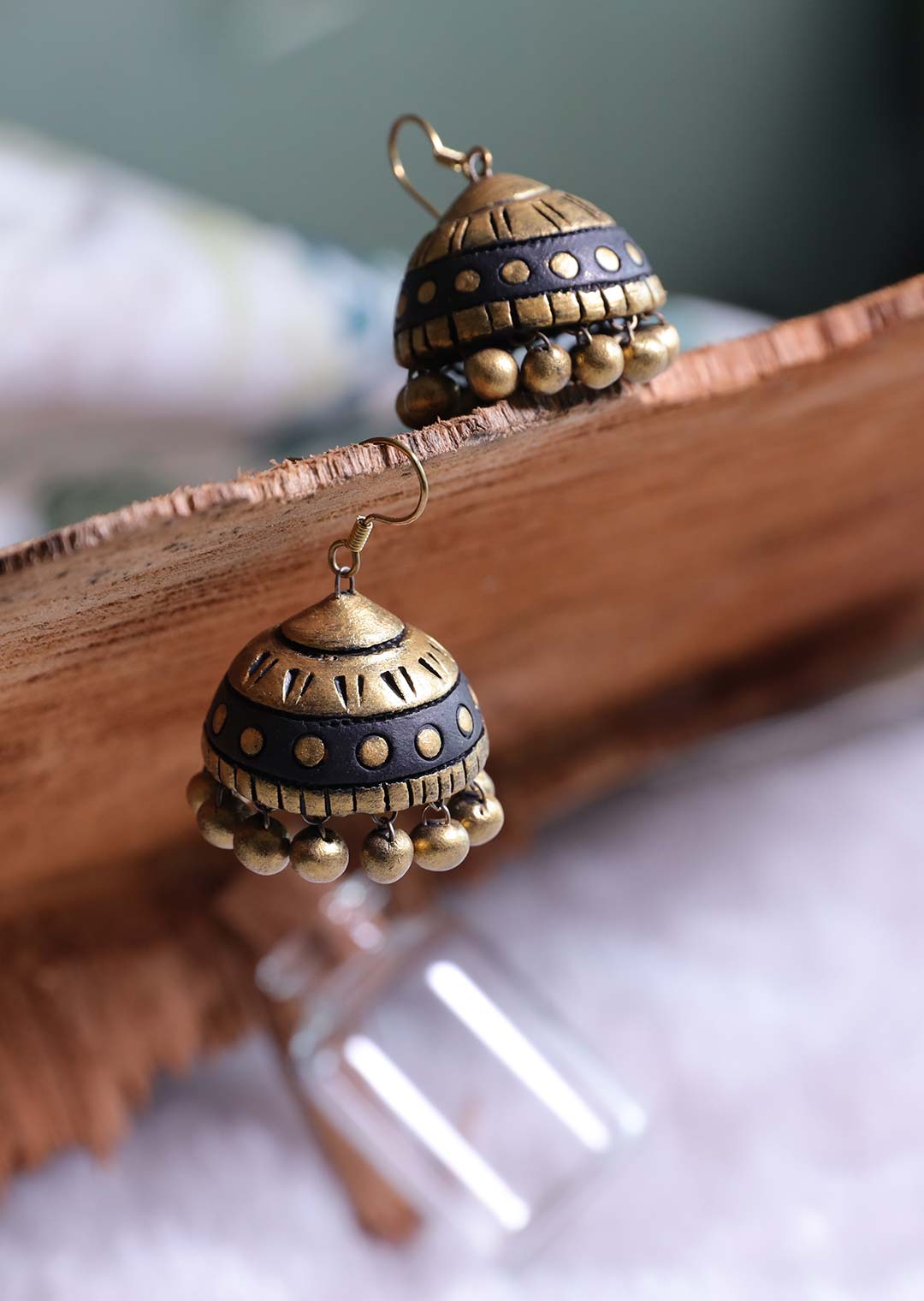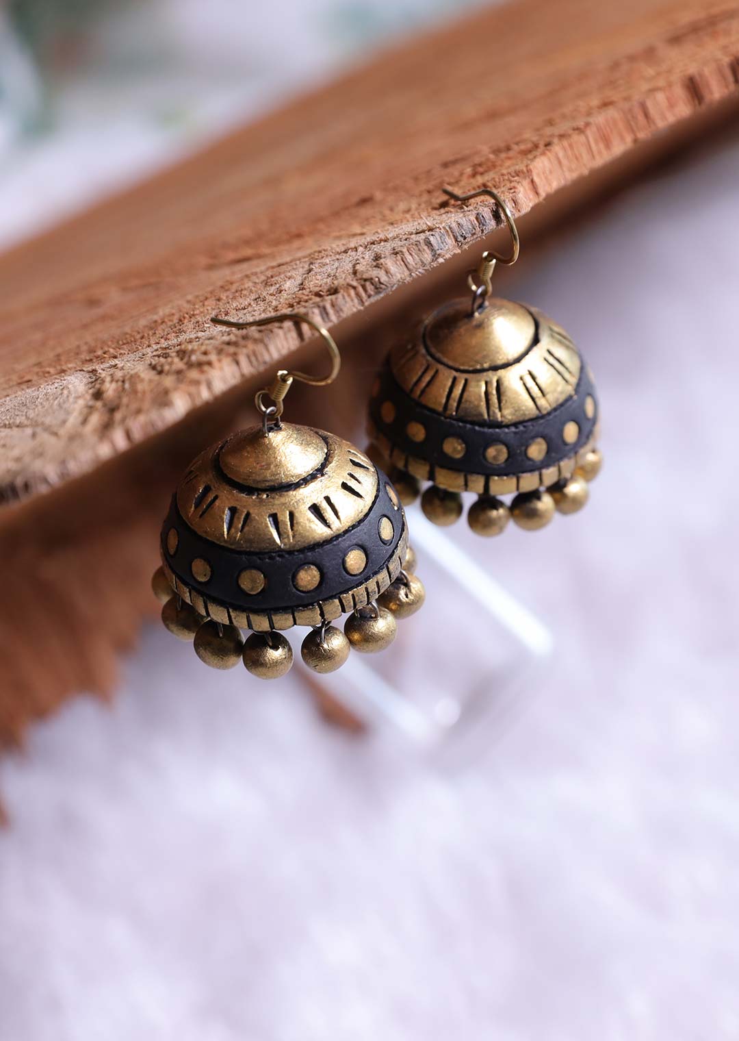 Elevate your style with our stunning black and gold designed earrings. These exquisite accessories blend the classic elegance of black with the opulence of gold, creating a captivating contrast that exudes sophistication. Each earring is meticulously crafted with attention to detail, ensuring a unique and luxurious look. The deep black elements provide a touch of mystery and drama, while the intricate gold design adds a touch of glamour and richness. These earrings are perfect for both formal occasions and adding a touch of elegance to your everyday look. Whether you're dressing up for a special event or simply want to make a statement, our black and gold designed earrings are the perfect choice to enhance your beauty and confidence.