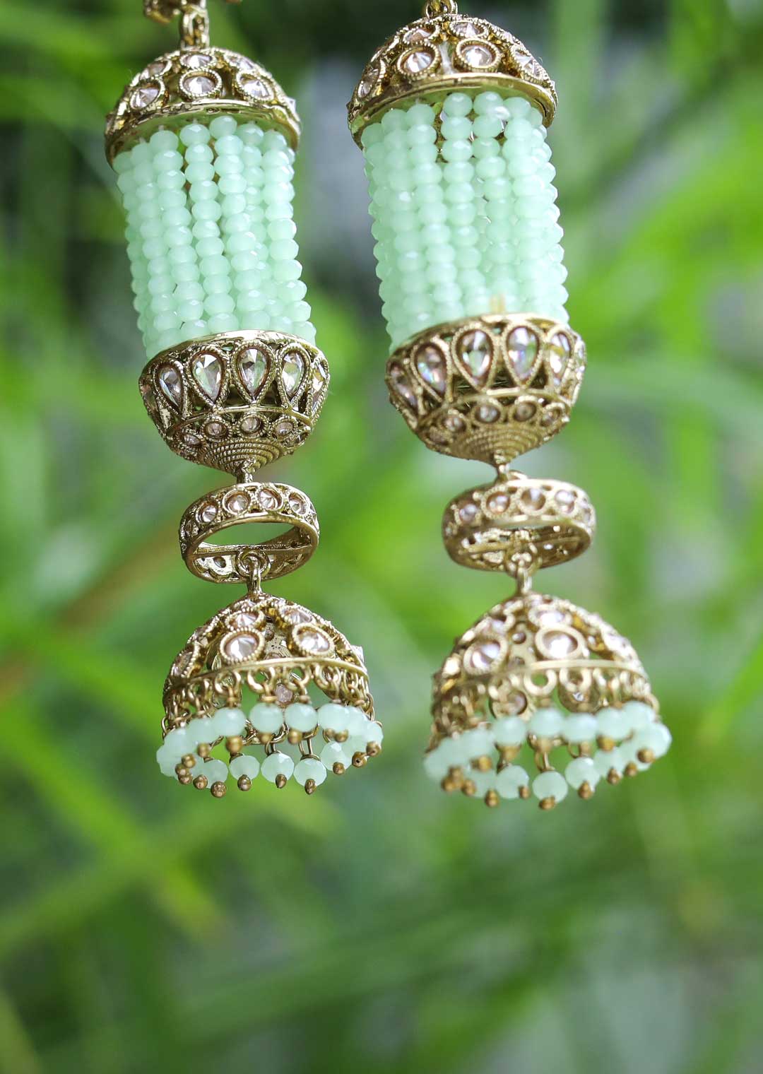 A pair of ethnic-inspired drop earrings. These stunning earrings in a bluish-green color add a touch of elegance to every outfit. Perfect for both casual and formal occasions, they effortlessly blend cultural charm with contemporary fashion.